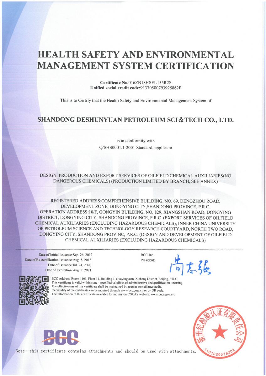 On August 13th 2020, the notice from Beijing New Century Inspection and Certification Co., Ltd., shows that the company has successfully passed the external supervision and audit of HSE certification of health, safety and environment management system. The management system meets the requirements of standard, therefore the company will continue to maintain the certification registration qualification, and the certificate continues to be valid as well.