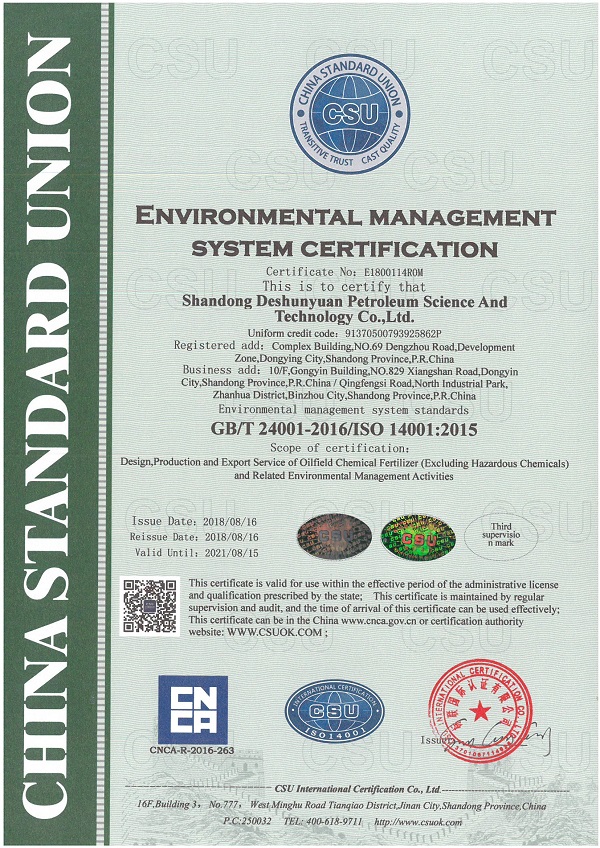 On August 19, 2020, the notice from CSU INTERNATIONAL CERTIFICATION CO., LTD., shows that Shandong Deshunyuan Petroleum Sci& Tech. Co., Ltd has successfully passed the second external supervision and audit of quality, environment and occupational health and safety management system certification. The management systems meet the requirements of standard, therefore the company will continue to maintain the certifications registration qualification, and the certificates continue to be valid as well.