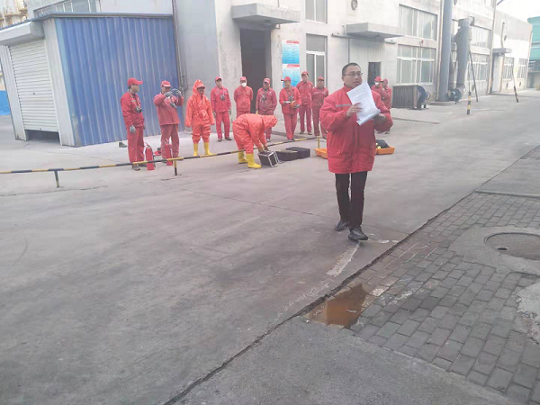 This drill simulated fire accident caused by static electricity due to leakage acrylic acid pump in polymer section. The response link was started in the on-site drill. After receiving the alarm information, the management personnel at all levels quickly assembled. According to the on-site fire assessment, the emergency Commander in chief Zang Yunfu immediately launched the company's on-site emergency plan for fire accident, went to the scene to command. The emergency team members should cooperate with each other, increase the number of on-site staff to deal with the initial fire danger, block and guard the scene of the accident, count the evacuation personnel, and implement road traffic control. The scene confirmed that the fire had been put out, no one was injured and trapped, and the drill was successfully completed.