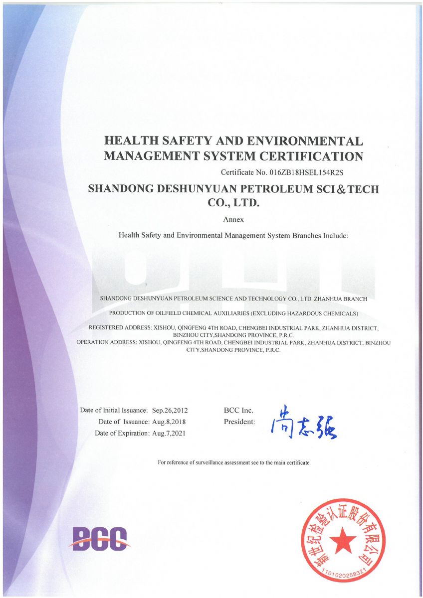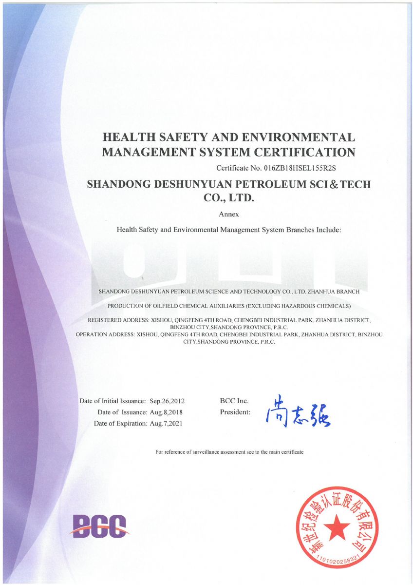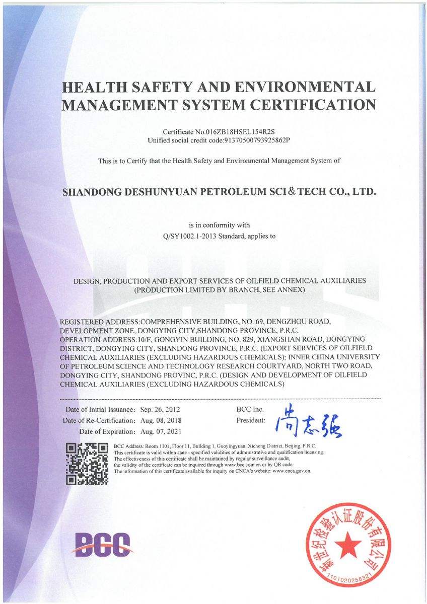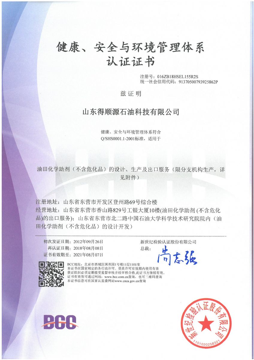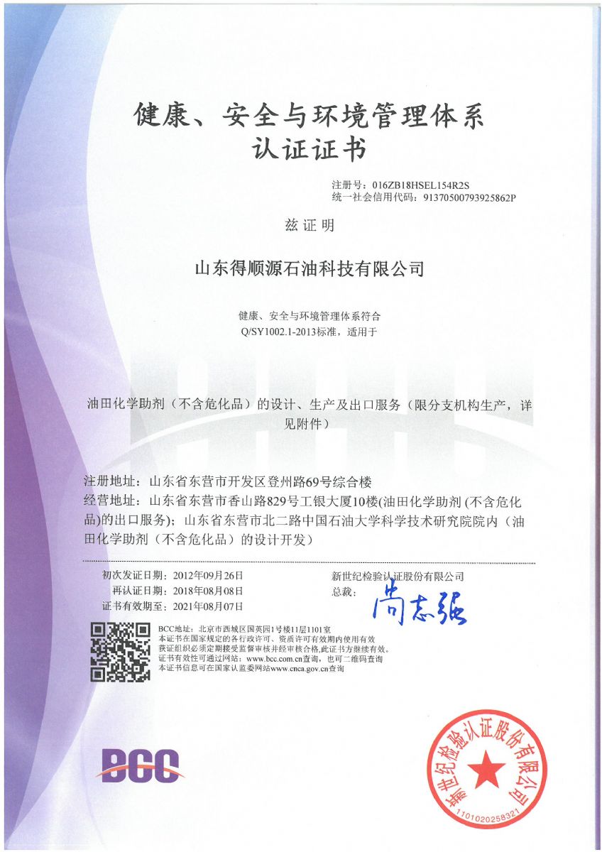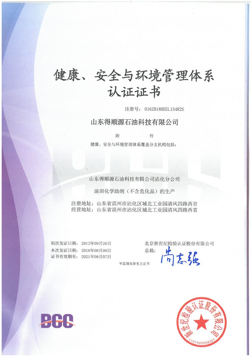 2018年8月,公司順利通過北京新世紀(jì)認證公司關(guān)于HSE認證的三年換證監(jiān)督審核,并收到了最新版的中石化和中石油HSE證書。