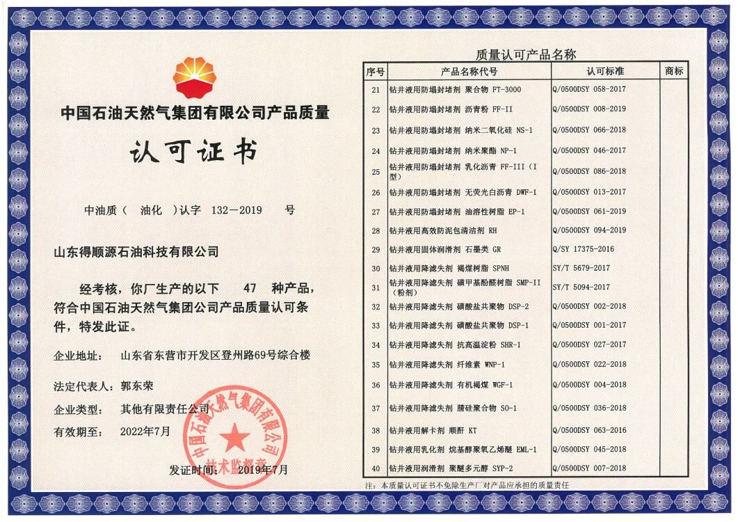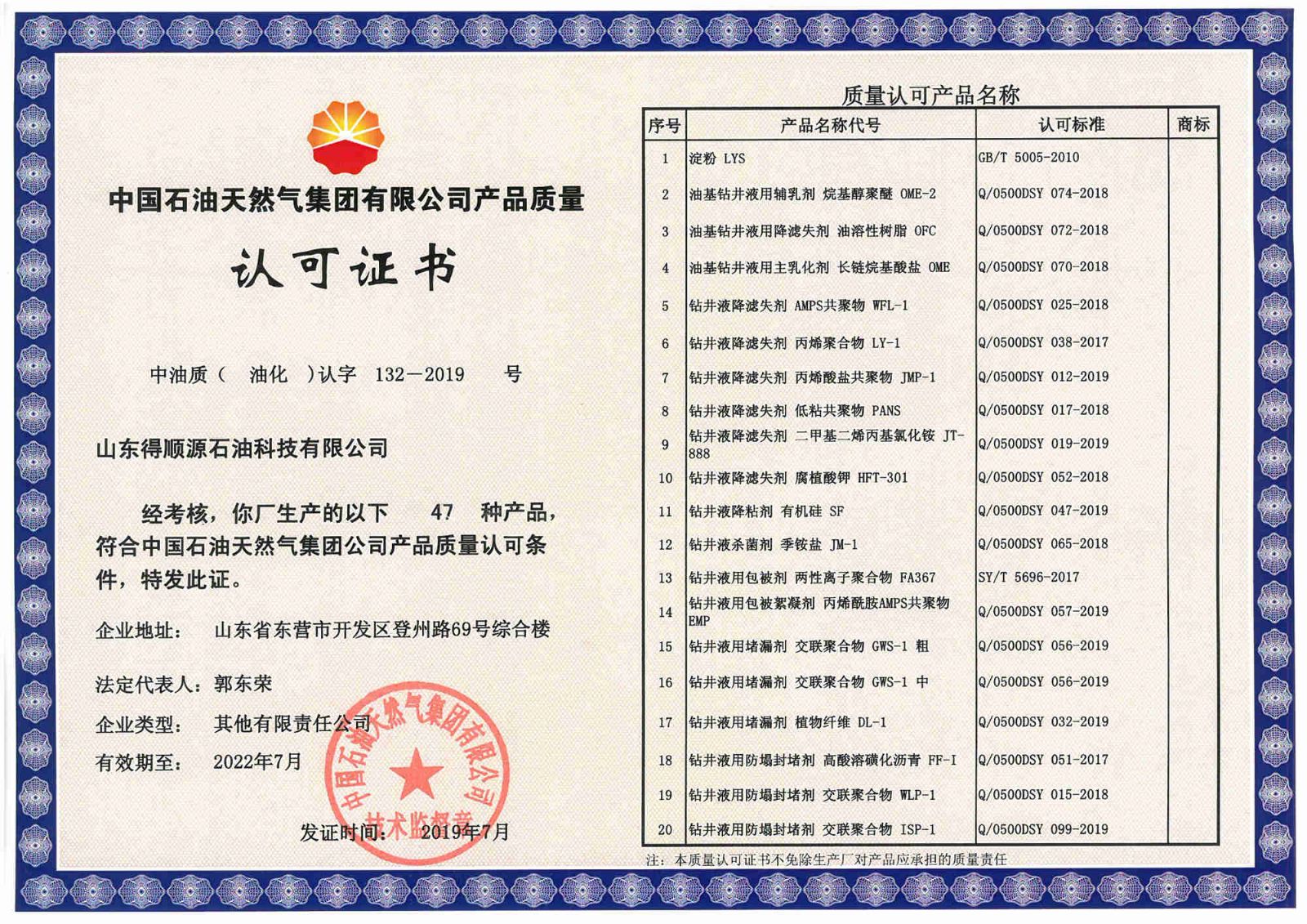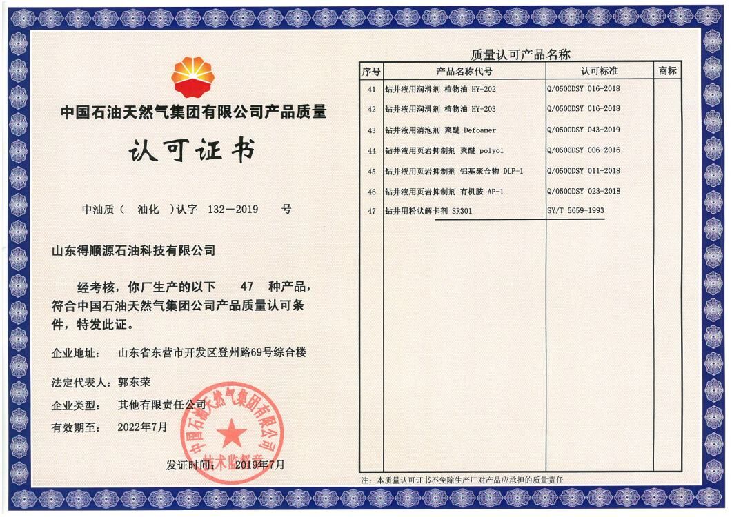2019年7月18日,公司順利通過(guò)了中石油產(chǎn)品質(zhì)量認(rèn)可證的換證復(fù)審,并換發(fā)新證書(shū)。其中抗高溫淀粉SHR-1、納米二氧化硅NS-1和清潔劑RH這三個(gè)產(chǎn)品也順利增加到中石油產(chǎn)品質(zhì)量認(rèn)可證內(nèi),產(chǎn)品數(shù)量增加到47個(gè)。