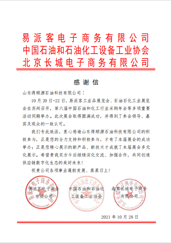2021年10月20日,2021易派客工業(yè)品展覽會(huì)暨石油石化工業(yè)展覽會(huì)在蘇州國(guó)際博覽中心開幕。這是目前國(guó)內(nèi)首個(gè)石油、煉油與化工行業(yè)泛工業(yè)品綜合展會(huì)。中石化集團(tuán)公司副總經(jīng)理劉宏斌、李永林出席開幕式并致辭,江蘇省副省長(zhǎng)胡廣杰出席。山東得順源石油科技有限公司受邀參加“易派客主題論壇暨戰(zhàn)略合作簽約儀式”、“易派客平臺(tái)核心關(guān)聯(lián)方座談會(huì)”和“油田化學(xué)劑專家論壇”等核心論壇。開幕式后孫衛(wèi)東副總經(jīng)理陪同中石化和江蘇省領(lǐng)導(dǎo)巡展各專業(yè)化展區(qū)。在“易派客主題論壇暨戰(zhàn)略合作簽約儀式”上孫衛(wèi)東副總經(jīng)理代表公司簽署《易派客平臺(tái)戰(zhàn)略合作協(xié)議》,成為鉆井液助劑行業(yè)唯一戰(zhàn)略合作單位。